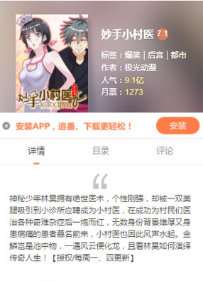 简介:《妙手小村医》“我是来看腿的!哦,不,我是来应聘的。”来历不明的神秘少年林昊被“美腿”吸引,进了一家福利待遇差到极点的小诊所做医生。绝世医术加上刚强个性,打破了小诊所的冷清肃条,刚上岗就得给“驴友”做了一个大手术。且看林昊如何演绎传奇人生!