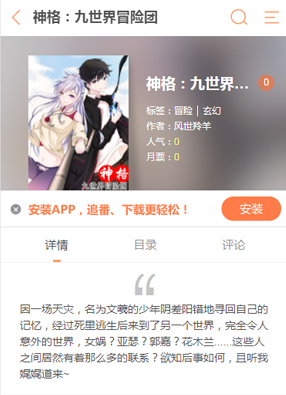简介:漫画《神格九世界冒险团》讲述了因一场天灾,名为文羲的少年阴差阳错地寻回自己的记忆,经过死里逃生后来到了另一个世界,完全令人意外的世界,女娲?亚瑟?郭嘉?花木兰......这些人之间居然有着那么多的联系?欲知后事如何,且听我娓娓道来~